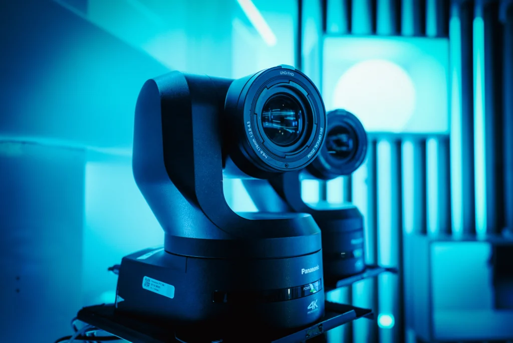 • Caméras de studio broadcast : dotées de capteurs CMOS ou CCD de grande taille, elles offrent une sensibilité élevée et une gamme dynamique étendue pour des images nettes et détaillées, même en basse lumière. Équipées de montures d’objectifs interchangeables.